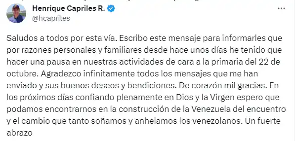 «Saludos a todos por esta vía. Escribo este mensaje para informarles que por razones personales y familiares desde hace unos días he tenido que hacer una pausa en nuestras actividades de cara a la primaria del 22 de octubre. Agradezco infinitamente todos los mensajes que me han enviado y sus buenos deseos y bendiciones. De corazón mil gracias. En los próximos días confiando plenamente en Dios y la Virgen espero que podamos encontrarnos en la construcción de la Venezuela del encuentro y el cambio que tanto soñamos y anhelamos los venezolanos. Un fuerte abrazo», escribió Capriles en la red X