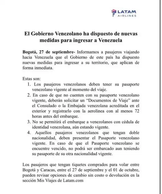 A través de sus redes sociales, la aerolínea Latam informó que el Gobierno del presidente Nicolás Maduro impartió medidas en cuanto al ingreso de venezolanos a través de los aeropuertos, entre ellas que no pueden entrar al país con el pasaporte vencido.