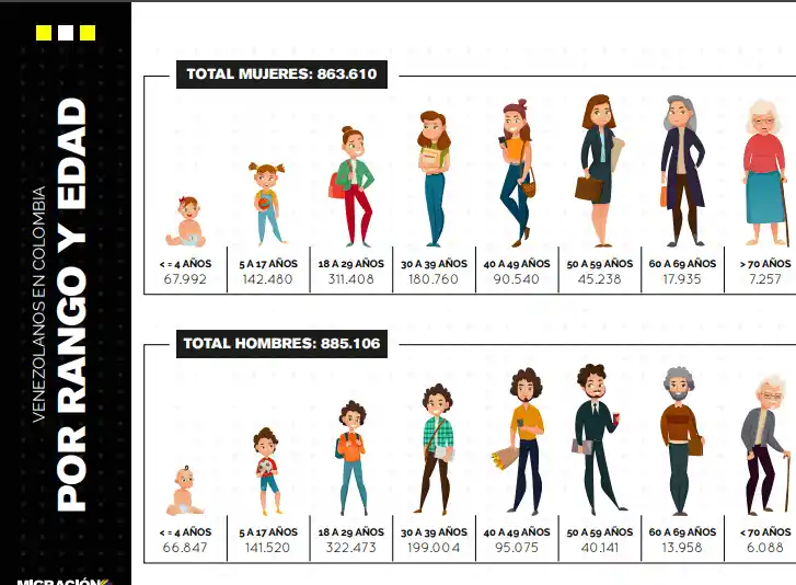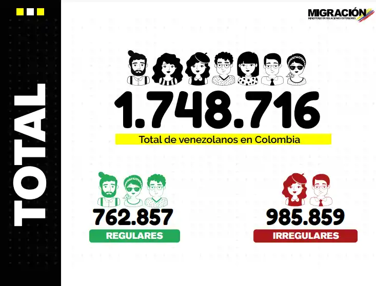 El balance también asegura que 985.859 (56%) migrantes venezolanos se encuentra en condición irregular y 762.857 (43%) cumplen con la normatividad migratoria que les permite permanecer de manera regular en el país.