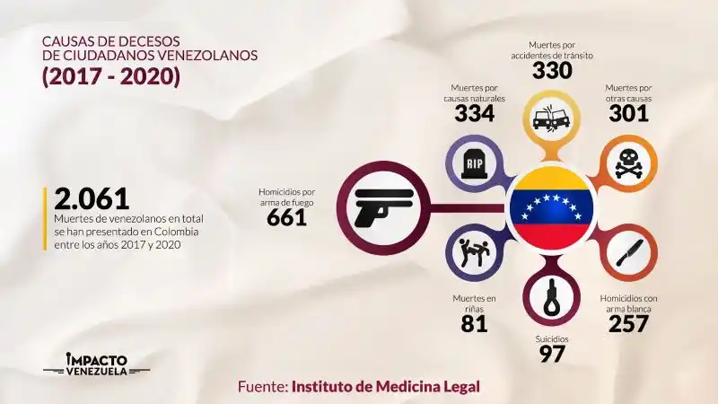 El informe detalla las causas de fallecimientos de los venezolanos en los últimos tres años y medio en el territorio Colombiano y, resulta sorprendente que 661 fueron homicidios por armas de fuego y las principales víctimas de esos decesos, hombres venezolanos.
