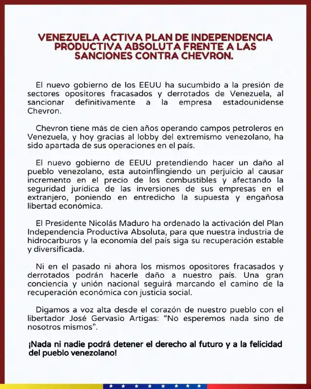 En un comunicado emitido por el Ejecutivo nacional, se anuncia que «Venezuela activa un plan de independencia productiva absoluta frente a las sanciones contra Chevron».