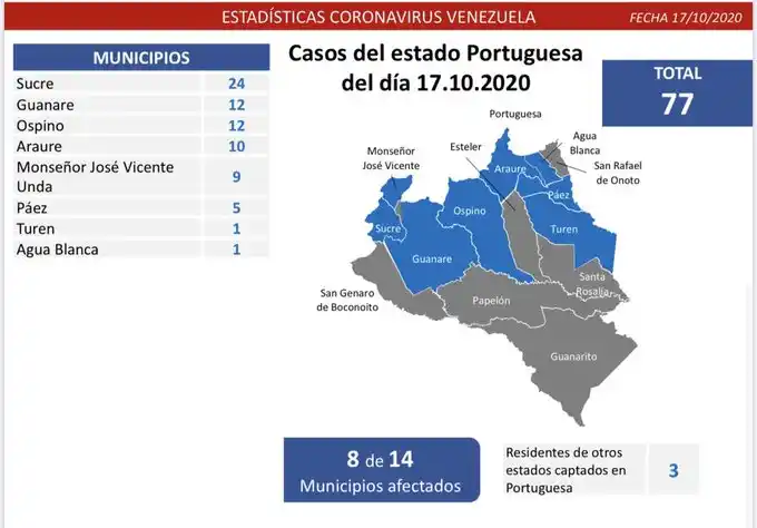 En la última jornada, el estado Portuguesa es la entidad que presenta la mayor cantidad de contagios. Se detectaron 77 casos activos en 8 de sus municipios. le siguen Yaracuy (72) y Carabobo (71) .