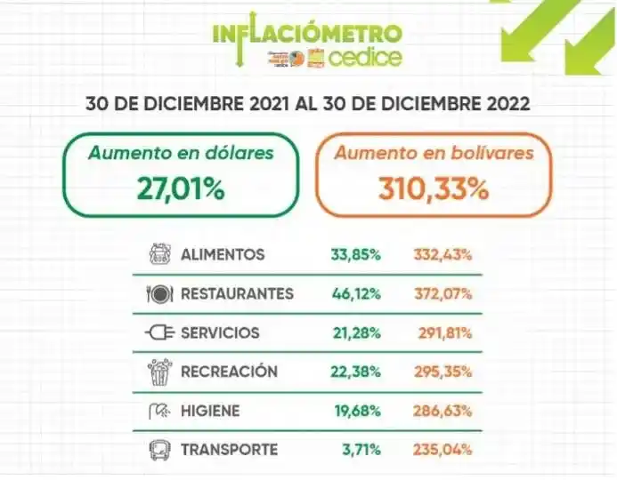 En el estudio, detalló que en promedio de las 3 ciudades monitoreadas (Caracas, Valencia y Maracaibo), el consumo promedio de 61 bienes y servicios adquiridos por una familia de 3 personas alcanzó el valor de 7.734,95 Bs/mes al cierre de 2022, equivalentes a 507,88 USD/mes, lo que representa un incremento de 310,33% en moneda nacional y de 27,01% en dólares estadounidenses durante 2022.