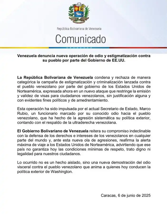 A través de un comunicado, el Gobierno de Venezuela condenó de manera categórica «la campaña de estigmatización y criminalización lanzada contra el pueblo venezolano por parte del Gobierno de los Estados Unidos».