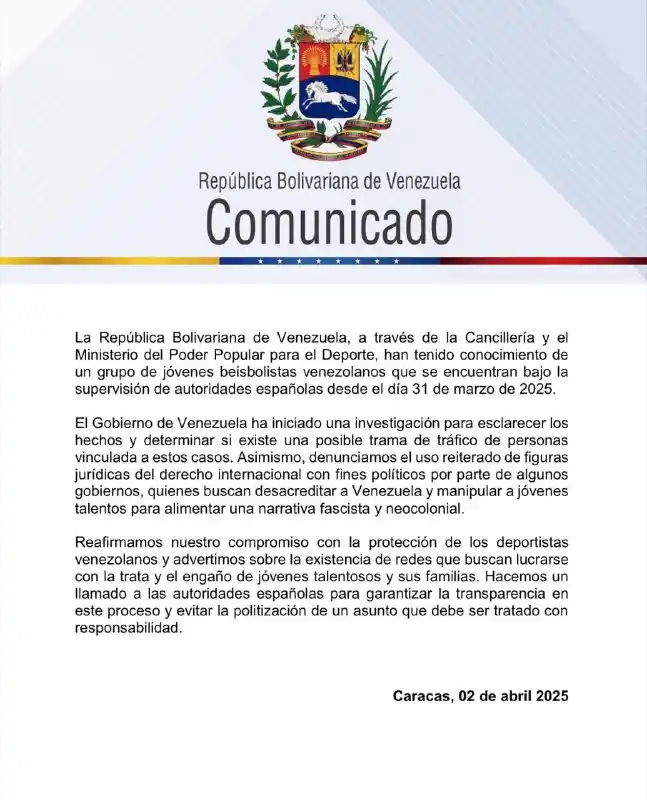 A través de un comunicado, tanto la cancillería como el ministerio del deporte informaron sobre la situación irregular de un grupo de jóvenes beisbolistas venezolanos bajo custodia de las autoridades españolas