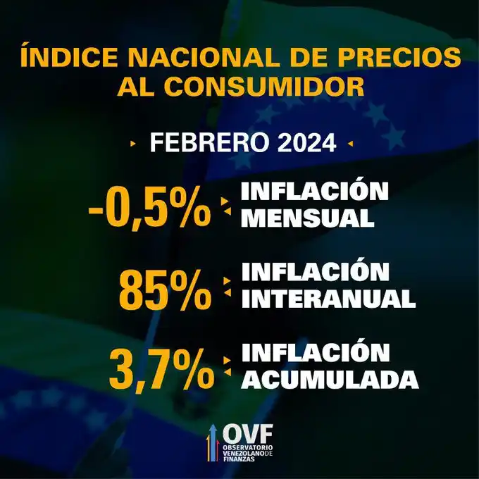 En febrero de 2024, Venezuela registró una deflación de 0,5%, según el Observatorio Venezolano de Finanzas.