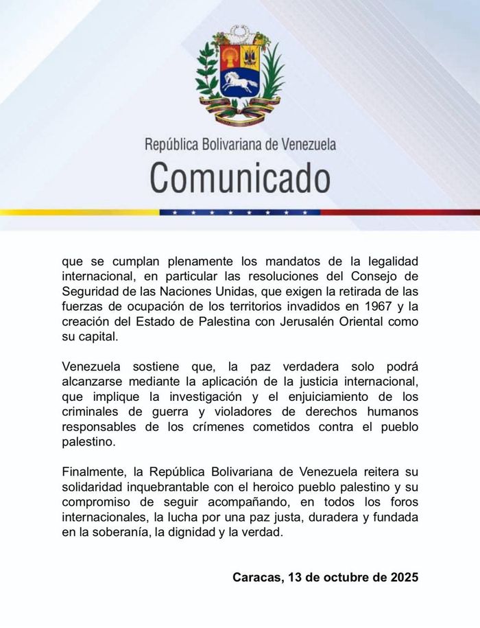 Venezuela atribuye los logros alcanzados en este proceso directamente a la presión internacional y a la movilización de los pueblos del mundo, quienes han reafirmado que «la causa palestina es una causa de toda la humanidad.»