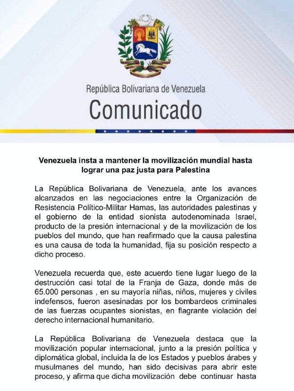 El Gobierno de Venezuela insta a mantener la movilización mundial hasta lograr una paz justa para Palestina.