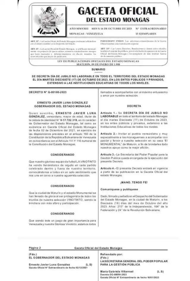 «En vista de los resultados obtenidos por nuestra gloriosa Selección Vinotinto, el gobernador Ernesto Luna tomó esta decisión. El pueblo de Monagas el día de mañana, esperará, celebrará esa gran victoria que seguro estamos tendrá nuestra selección. Por lo tanto, el exhorto es a tomar todas las previsiones al caso, esperando que nuestra selección obtenga esos tres valiosos puntos», expresó la funcionaria.