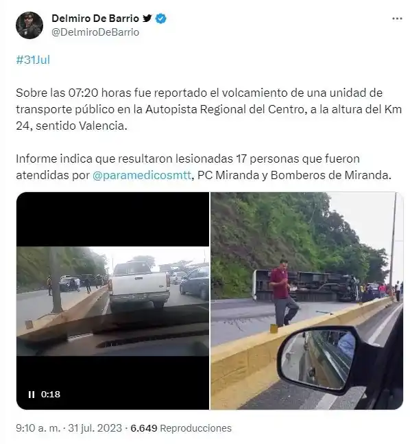 La mañana de este lunes 31 de julio ocurrió un accidente en el kilómetro 24 de la Autopista Regional del Centro (ARC), en sentido a Valencia, en el que se registraron al menos 17 heridos.