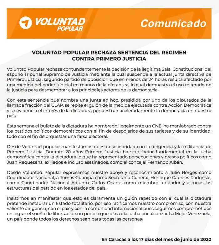 «Advertimos que este ataque contra AD no es el único ni el primero del régimen, es una práctica que se viene dando desde 2010 cuya intención es instaurar un estado totalitario. Diez de las organizaciones de oposición más votadas han sido anuladas o inhabilitadas: MUD, PJ, VP, UNT, LCR, ABP, MPV, PV, CC y GE. Siete partidos han sido intervenidos: AD, Copei, PPT, Bandera Roja, Podemos, MEP, MinUnidad. Cuatro partidos nunca pudieron inscribirse: Vente, Marea Socialista, MDD, UNO», alertó VP en un comunicado.