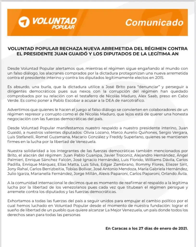 Desde Voluntad Popular manifestaron su «respaldo a Juan Guaidó, a nuestros valientes diputado» mencionados por Brito.