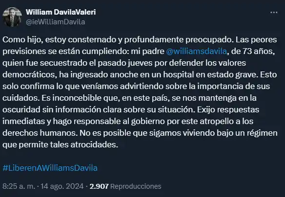 La advertencia la hizo William Alejandro Valeri, hijo del exgobernador de Mérida, Williams Dávila, quien, a través de su cuenta en X, hizo responsable de lo que pueda ocurrir a su progenitor, al gobierno de Nicolás Maduro.