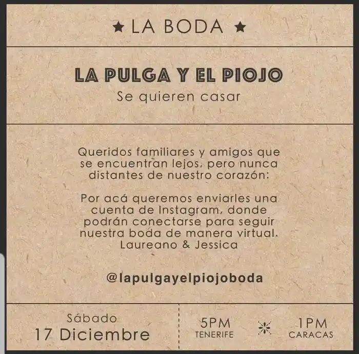 «La Pulga y El Piojo se quieren Casar», es el encabezado de la invitación a la boda que se llevo a cabo este #17Dic en la isla de Tenerife, España, donde el cómico y politólogo venezolano, Laureano Márquez, fue atrapado por la belleza de la entrenadora Jessica Naranjo.