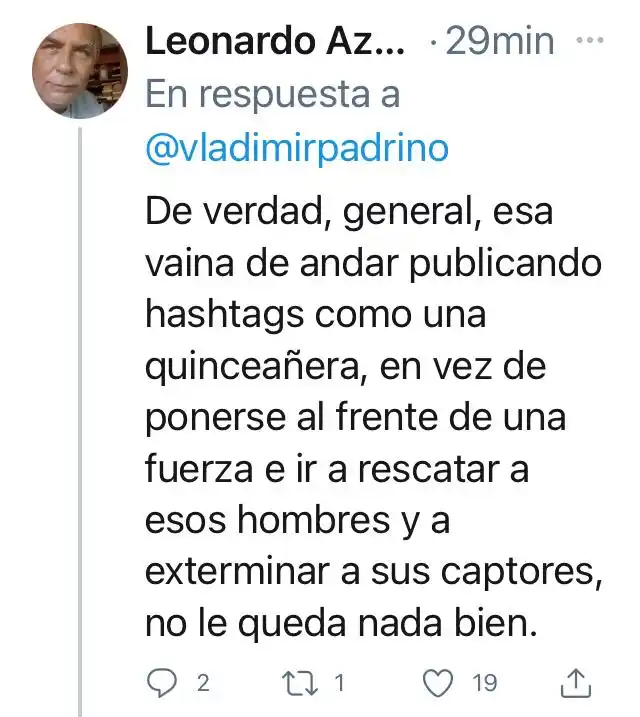 A través de twiiter y con un video en el que se muestran a un grupo de uniformados de la FANB al grito de “Apure es nuestro, liberen a los patriotas”, el ministro de la Defensa, Vladimir Padrino López envió un mensaje a los captores.